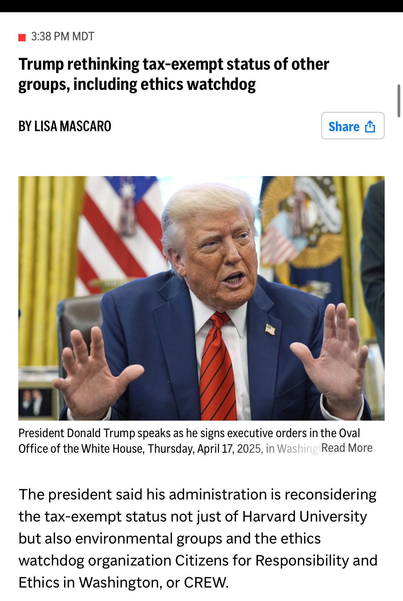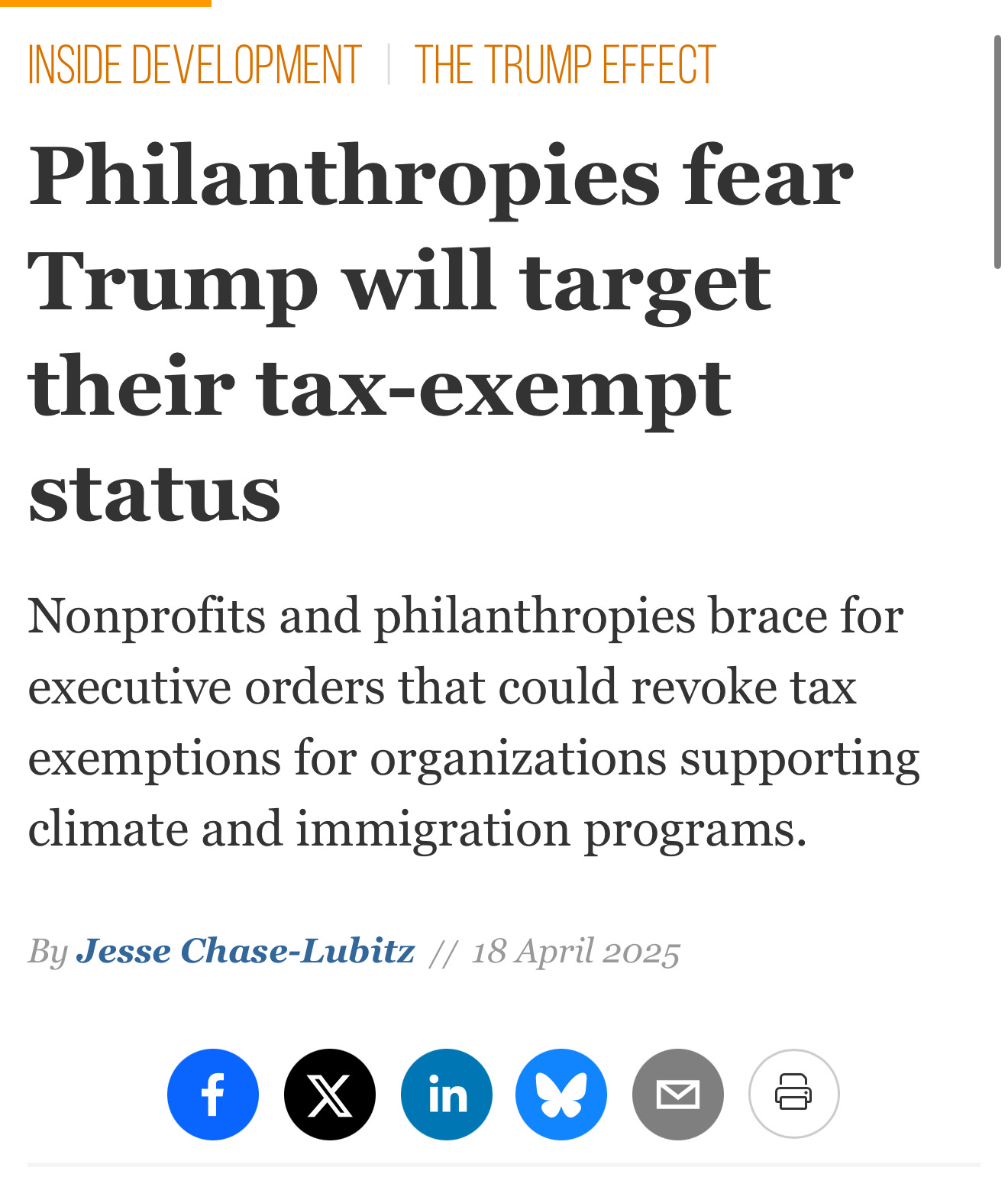It’s unsurprising that the next target are non-profits. This was never about curbing “government spending”. We’re dealing with a government uninterested in democracy. It’s about scaring people from exercising their rights, specifically the 1st Amendment. We are in a dark place right now and I’m not confident that we call this “slipping into authoritarianism” anymore.