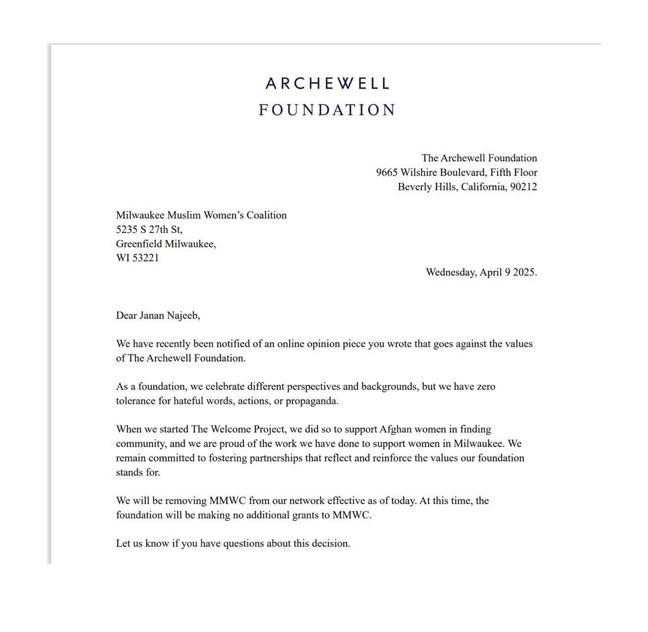 -Independent verification from the Milwaukee Journal Sentinel confirmed the letter sent by Archewell to Najeeb at the Muslim Women’s Coalition ending their grant was legit.