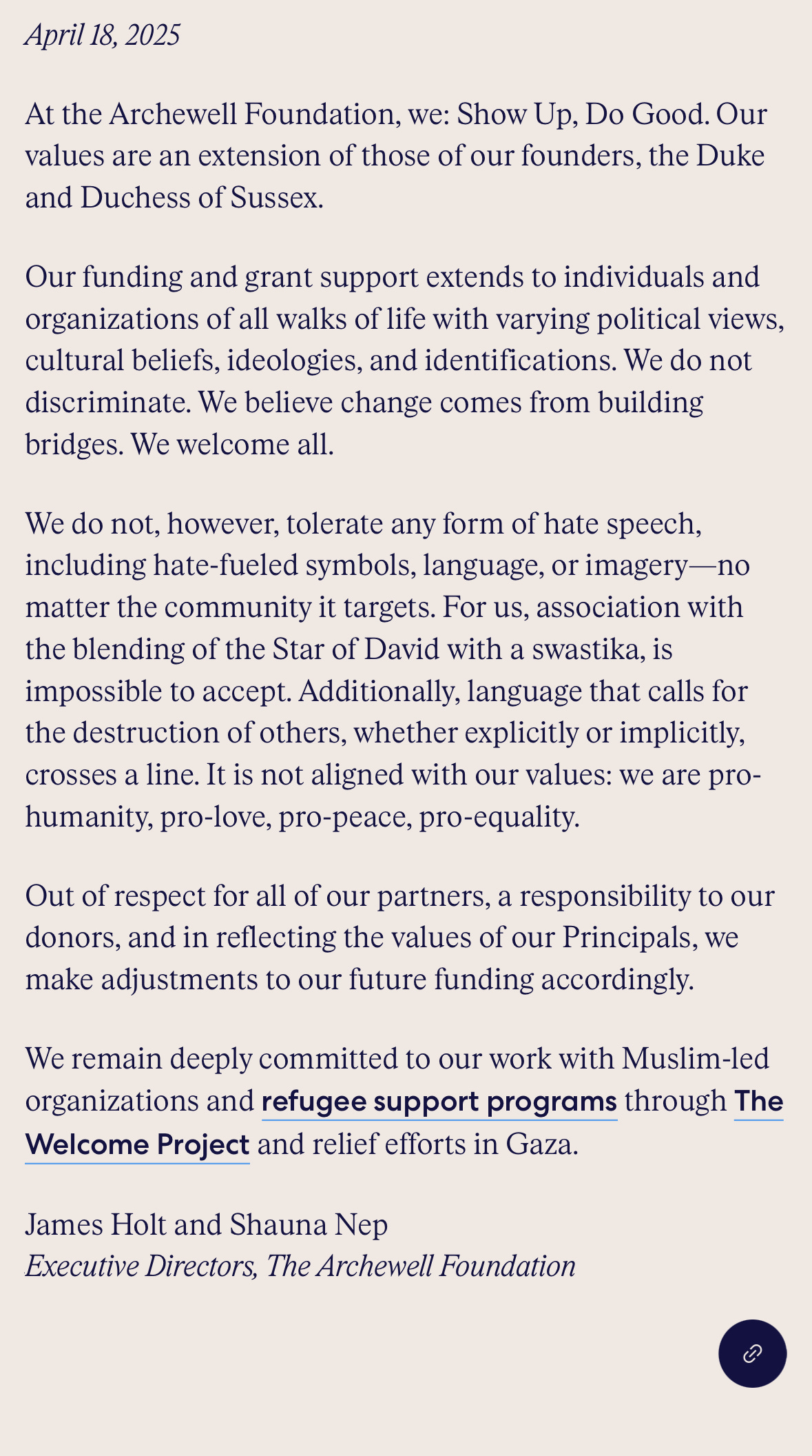 Archewell has every right to define their boundaries and pull funding. I think there was a better way to craft a message that accomplished that without playing into a right-wing narrative about pro-Palestinian activists and considered the impact on MWC—beyond the loss of funding.