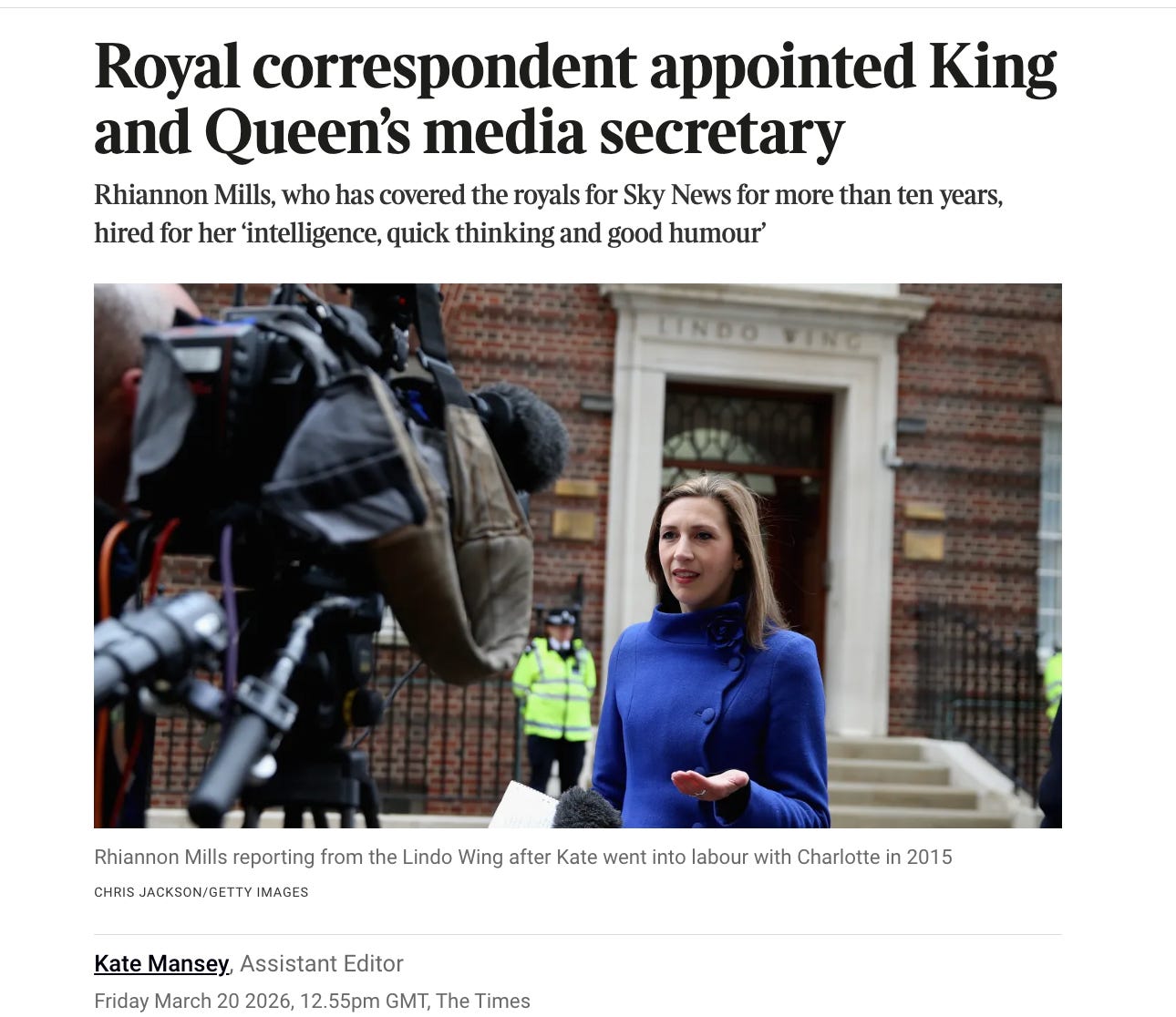 “Now Mills has been poached to join the royal household, moving away from reporting on the royal family, of which she has sometimes been critical, to help with their PR.”